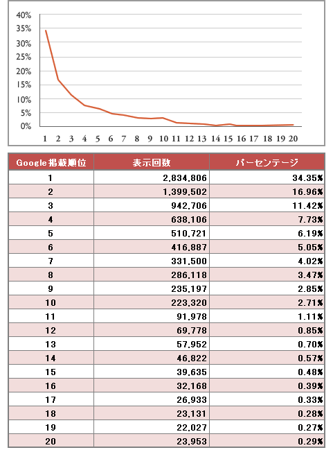検索エンジンでの検索結果の順位と、クリックされる回数との関係を示すデータが公表されていましたので、紹介させてもらいます。