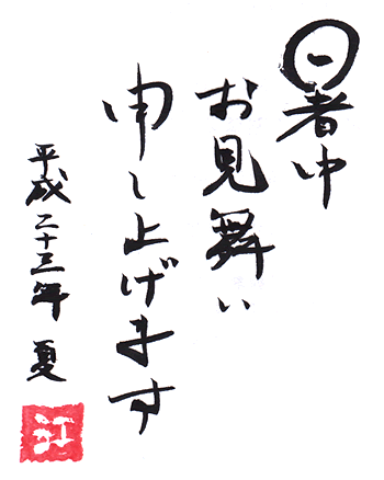 暑中お見舞い申し上げます 2011.07.23 WEB社長日記 E.Masakatsu いよいよ夏本番ですね。今年もこのまま猛暑になっていくのでしょうか? 節電の夏で、大変かと思いますが、みなさまお身体、ご自愛くださいませ。 最近凝っている筆ペンで書いてみました。 習字なんて習ったことないんで、ヘタくそですけど、文字を書いてると心が落ち着いてきていいですね・・・・(^-^) ちなみに、ハンコは消しゴムを削ってつくってみました 😳
