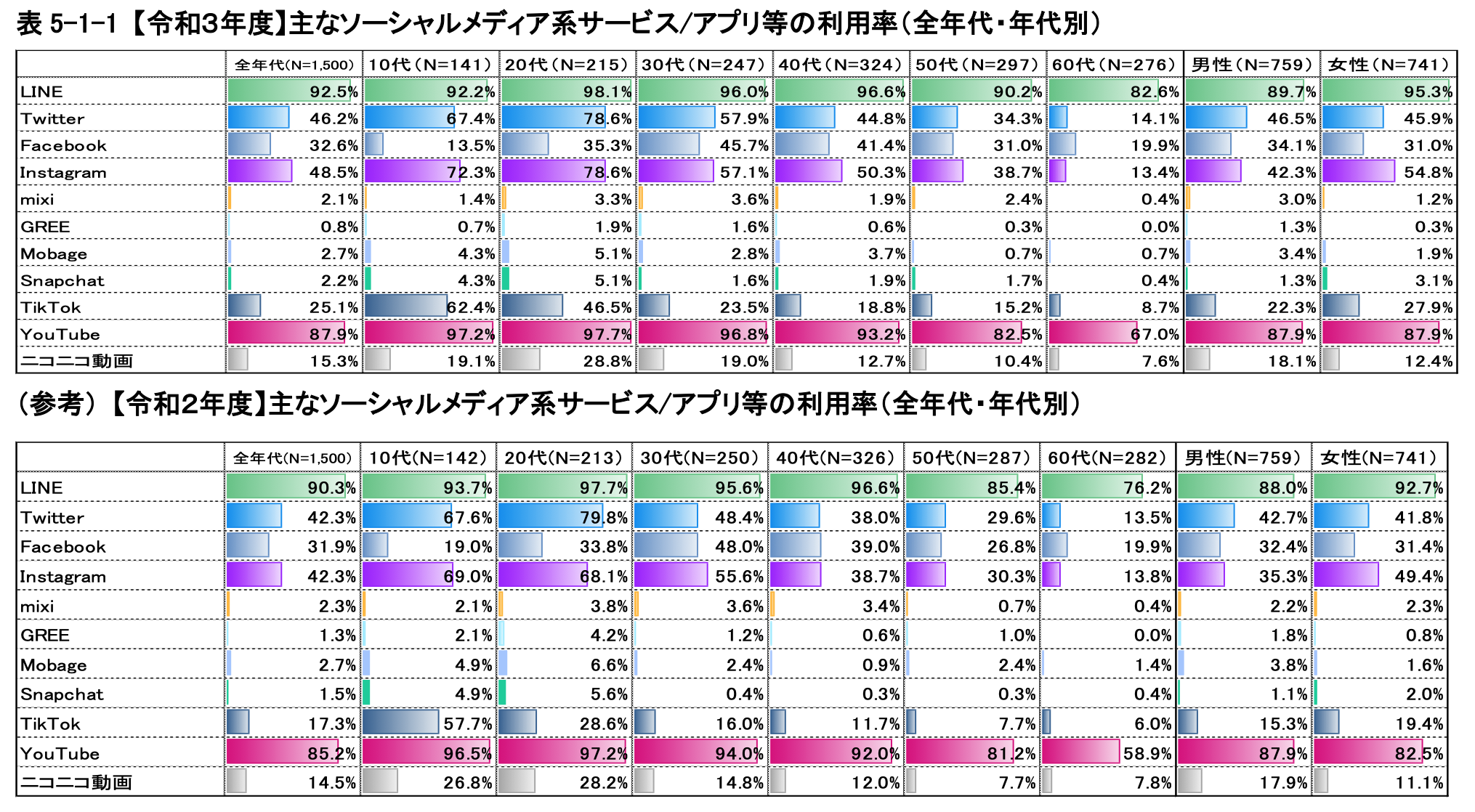 全年代では、「LINE」及び「Twitter」が平成 24 年の調査開始から、「Instagram」が平成 27 年の調査開始から 一貫して増加しており、「Twitter」及び「Instagram」が「Facebook」を上回る傾向が続いている。年代別では、各年代で「LINE」の利用率が最も高く、「Twitter」「Instagram」がそれに続く年代が多く見られ る中で、60 代では、引き続き「Facebook」が「LINE」に次いで高い利用率となっている。「mixi」「Mobage」及び「GREE」は、全年代及び各年代で1桁の利用率が多くなっており、各年代で利用率が 1%を下回るようになってきているサービスもある。