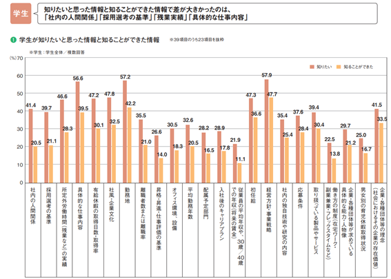 『知りたいと思った情報と知ることができた情報で差が大きかったのは、「社内の人間関係」「採用選考の基準」「残業実績」「具体的な仕事内容」』