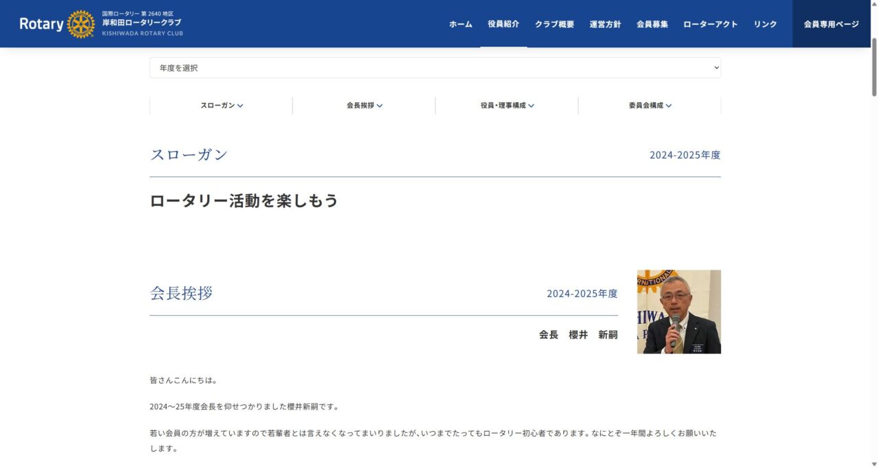 岸和田ロータリークラブ 様 スマートフォンでの表示 役員紹介ページ 顧客名 岸和田ロータリークラブ(Rotary Club of Kishiwada) URL https://www.kishiwada-rc.com/ 制作物 ホームページ 業種 各種団体・ボランティア エリア 大阪府岸和田市