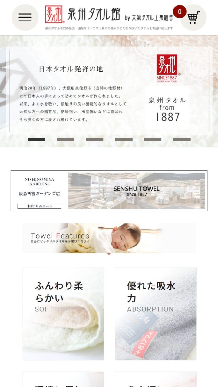 泉州タオル館 様 スマートフォンでの表示 商品詳細ページ 顧客名 大阪タオル工業組合 URL https://www.senshu-towel.jp/ 制作物 ホームページ 業種 販売・卸・雑貨 エリア 大阪府泉佐野市