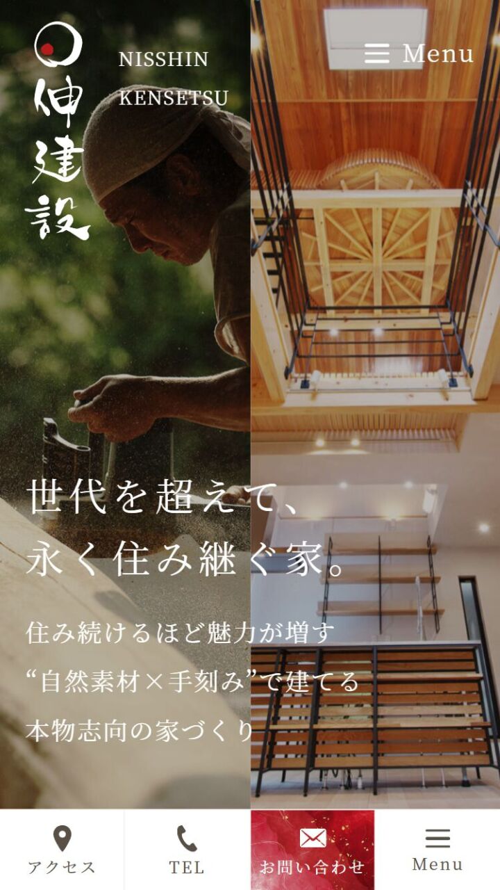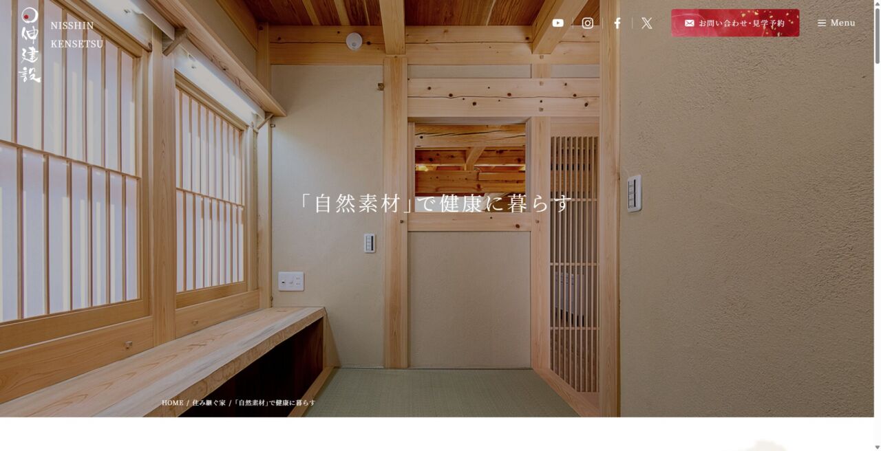 (株)日伸建設 様 スマートフォンでの表示 「自然素材」で健康に暮らすページ 顧客名 株式会社 日伸建設 URL https://to-ryou.com/ 制作物 ホームページ ブランディング 業種 建築・住宅・不動産 エリア 大阪府交野市