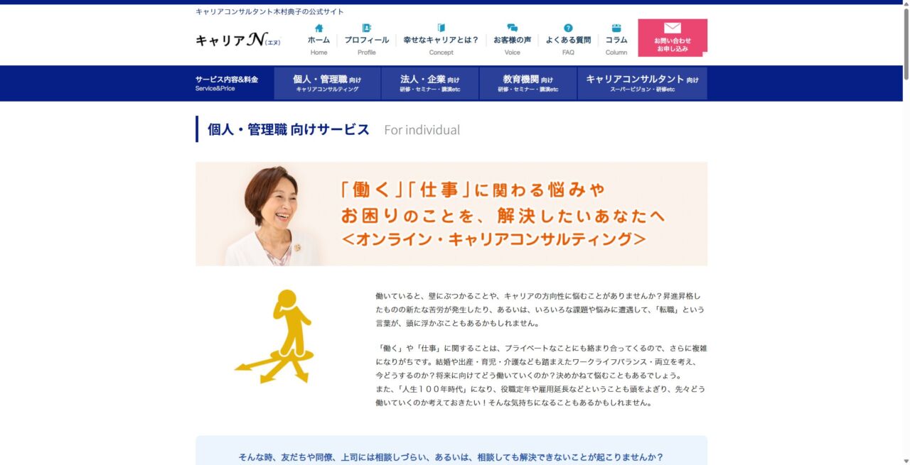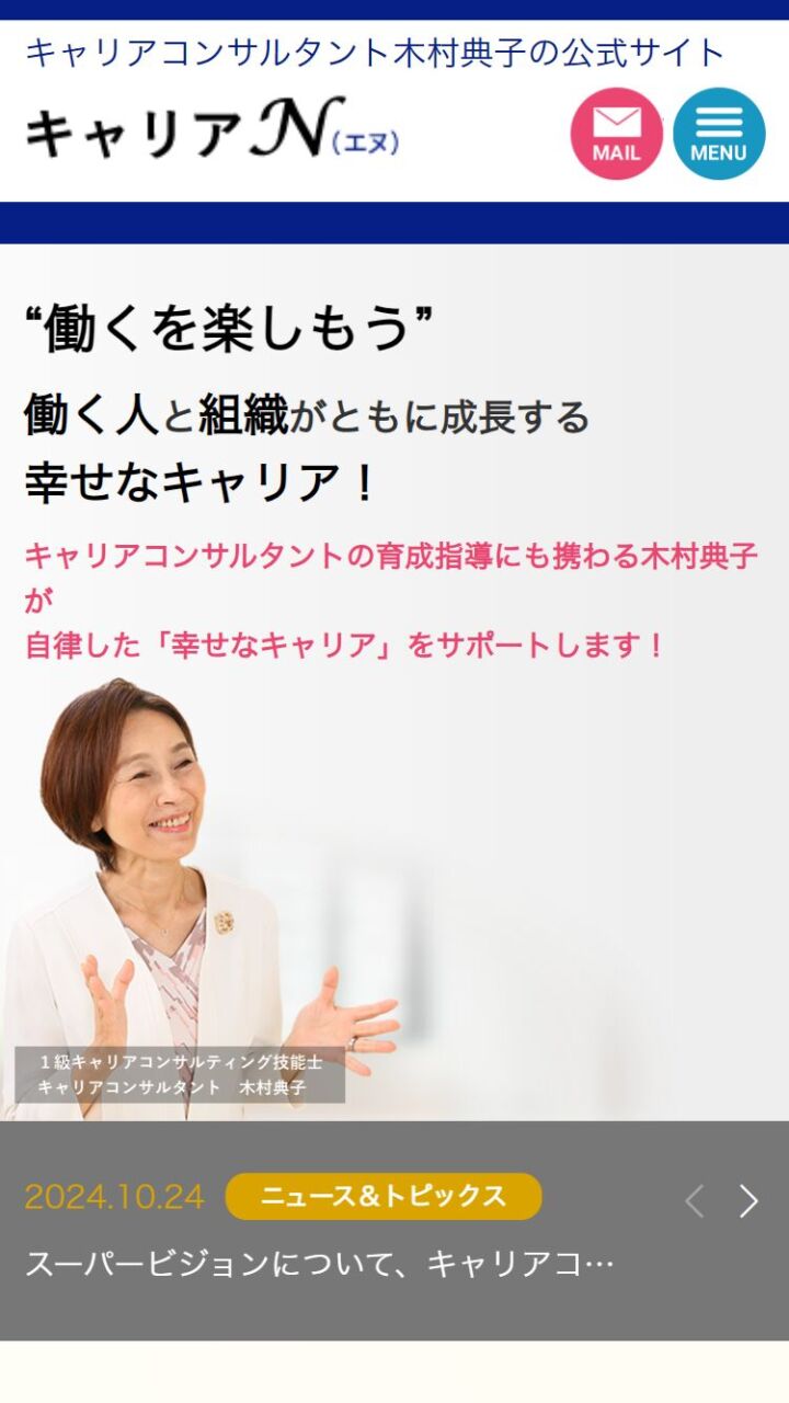 キャリアN 様 スマートフォンでの表示 商品詳細ページ 顧客名 キャリアコンサルタント 木村典子 URL https://www.career-n.com/ 制作物 ホームページ 業種 採用・派遣・求人 エリア 大阪府大阪市