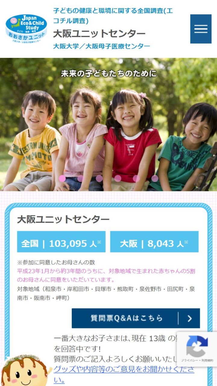 エコチル調査 大阪ユニットセンター 様 スマートフォンでの表示 エコチル調査についてページ 顧客名 大阪母子医療センター URL https://www.ecochil-osaka.jp/ 制作物 ホームページ 業種 医療・福祉・環境 エリア 大阪府