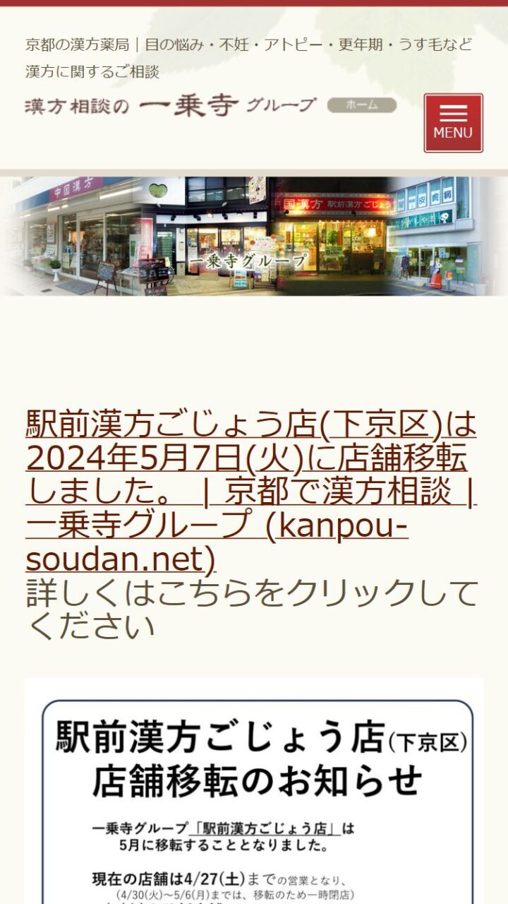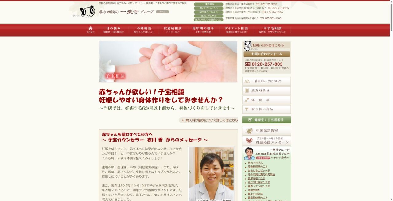 一乗寺グループ 様 スマートフォンでの表示 子宝相談ページ 顧客名 一乗寺グループ URL https://www.kanpou-soudan.net/ 制作物 ホームページ 業種 医療・福祉・環境 エリア 京都府京都市