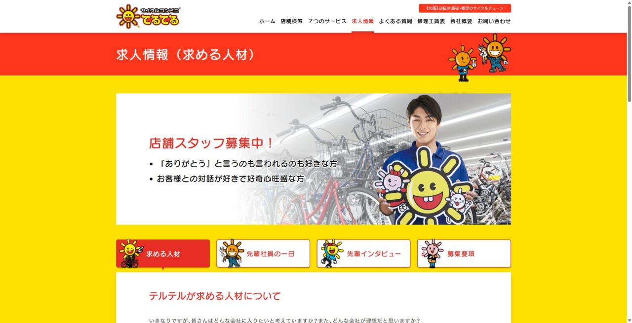 サイクルコンビニ てるてる 様 スマートフォンでの表示 求人情報ページ 顧客名 株式会社 テルテルアドバンス URL https://www.teruteru.co.jp/ 制作物 ホームページ 業種 自動車・自転車 エリア 大阪府大阪市