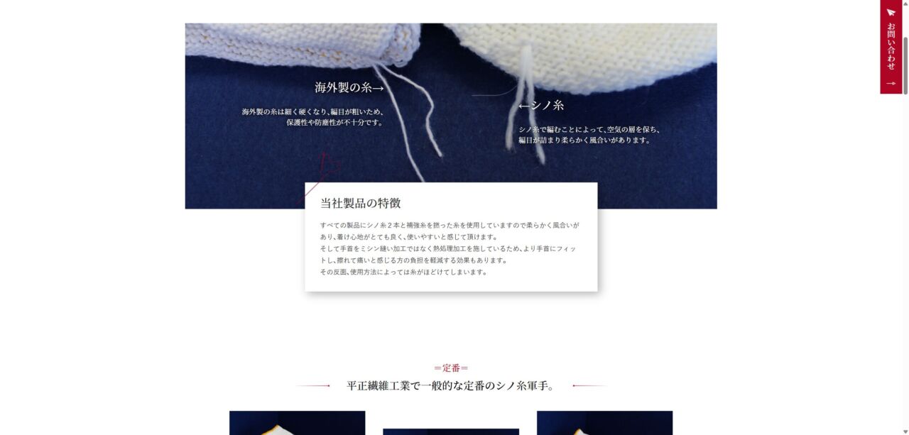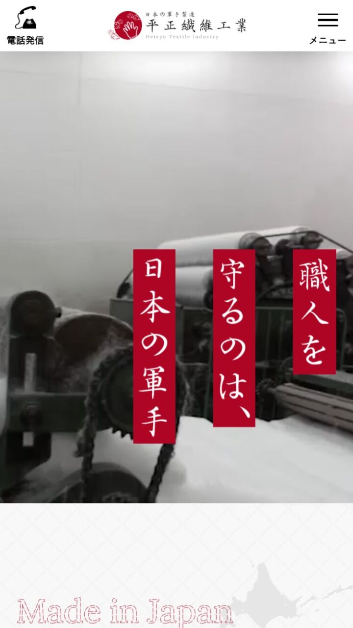 (有)平正繊維工業 様 スマートフォンでの表示 製品ページ 顧客名 有限会社 平正繊維工業 URL https://heisyoseni.co.jp/ 制作物 ホームページ 業種 製造・工業 エリア 大阪府泉南市