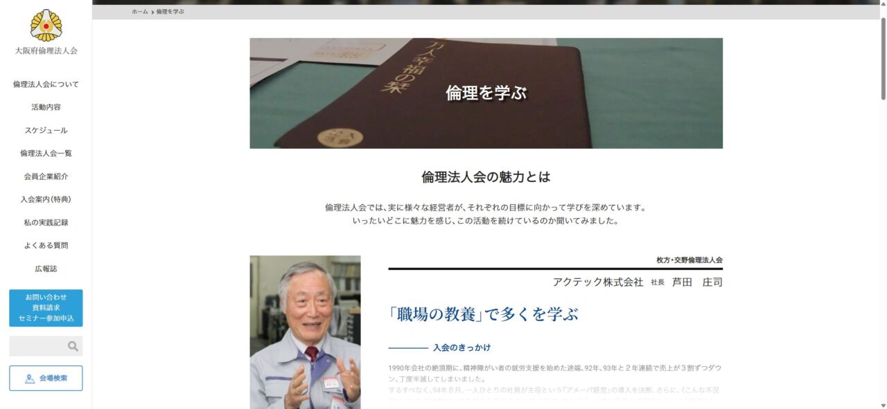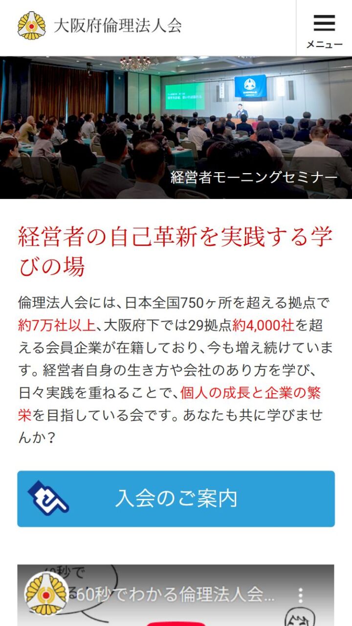 大阪府倫理法人会 様 スマートフォンでの表示 採用情報ページ 顧客名 一般社団法人 倫理研究所 大阪府倫理法人会 URL https://osaka-rinri.net/ 制作物 ホームページ 業種 各種団体・ボランティア エリア 大阪府