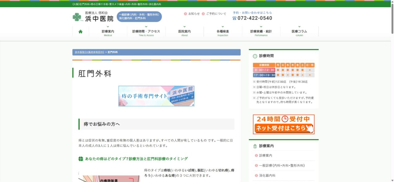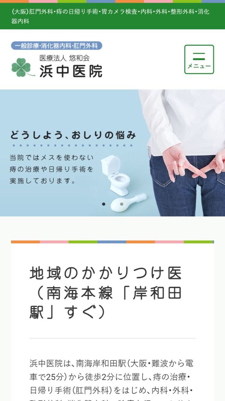 浜中医院 様 スマートフォンでの表示 診療ページ(肛門外科) 顧客名 医療法人 悠和会 浜中医院 URL https://hamanakaiin.com/ 制作物 ホームページ 業種 医療・福祉・環境 エリア 大阪府岸和田市
