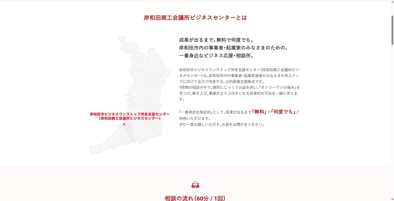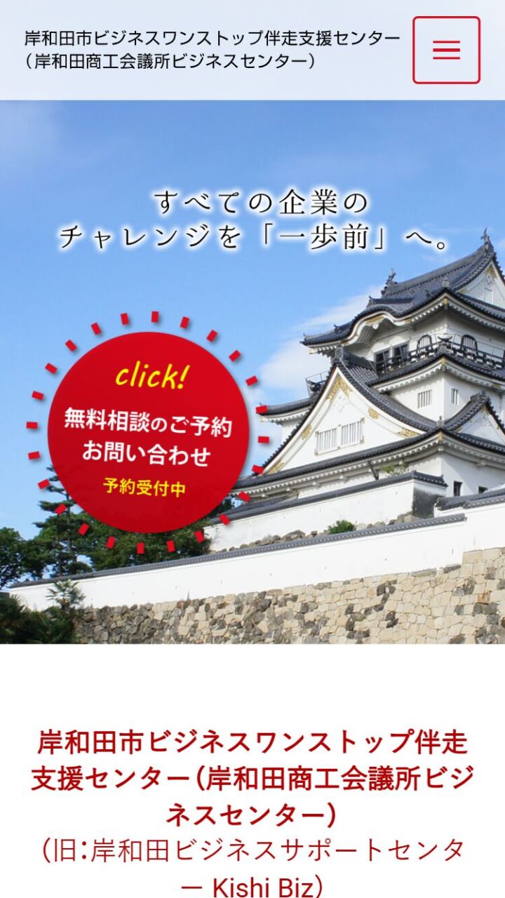 岸和田商工会議所 ビジネスセンター 様 スマートフォンでの表示 概要ページ 顧客名 岸和田市ビジネスワンストップ伴走支援センター(旧:岸和田ビジネスサポートセンター Kishi Biz) URL https://kishi-biz.jp/ 制作物 ホームページ 業種 コンサルティング エリア 大阪府岸和田市