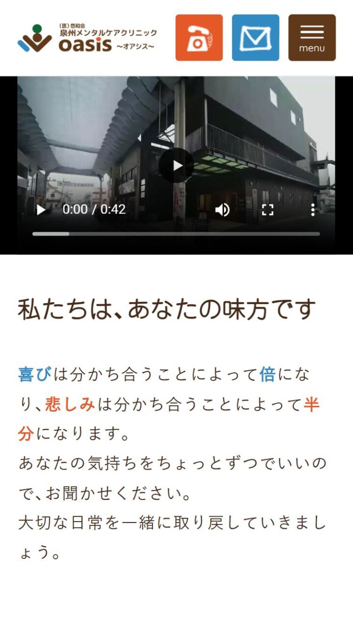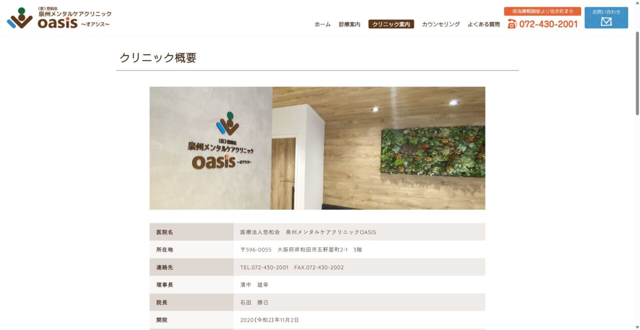 泉州メンタルケアクリニック oasis~オアシス~ 様 スマートフォンでの表示 概要ページ ロゴマーク 顧客名 医療法人悠和会 泉州メンタルケアクリニック OASIS URL https://clinic-oasis.com/ 制作物 ホームページ ロゴマーク 業種 医療・福祉・環境 エリア 大阪府岸和田市