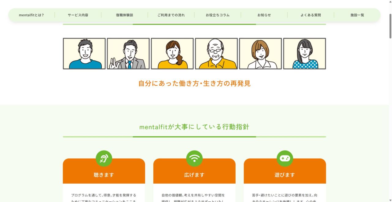 mentalfit 様 スマートフォンでの表示 理念ページ 顧客名 有限会社野花ヘルスプロモート URL https://mentalfit.jp/ 制作物 ホームページ 業種 医療・福祉・環境 エリア 大阪府