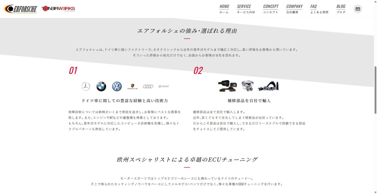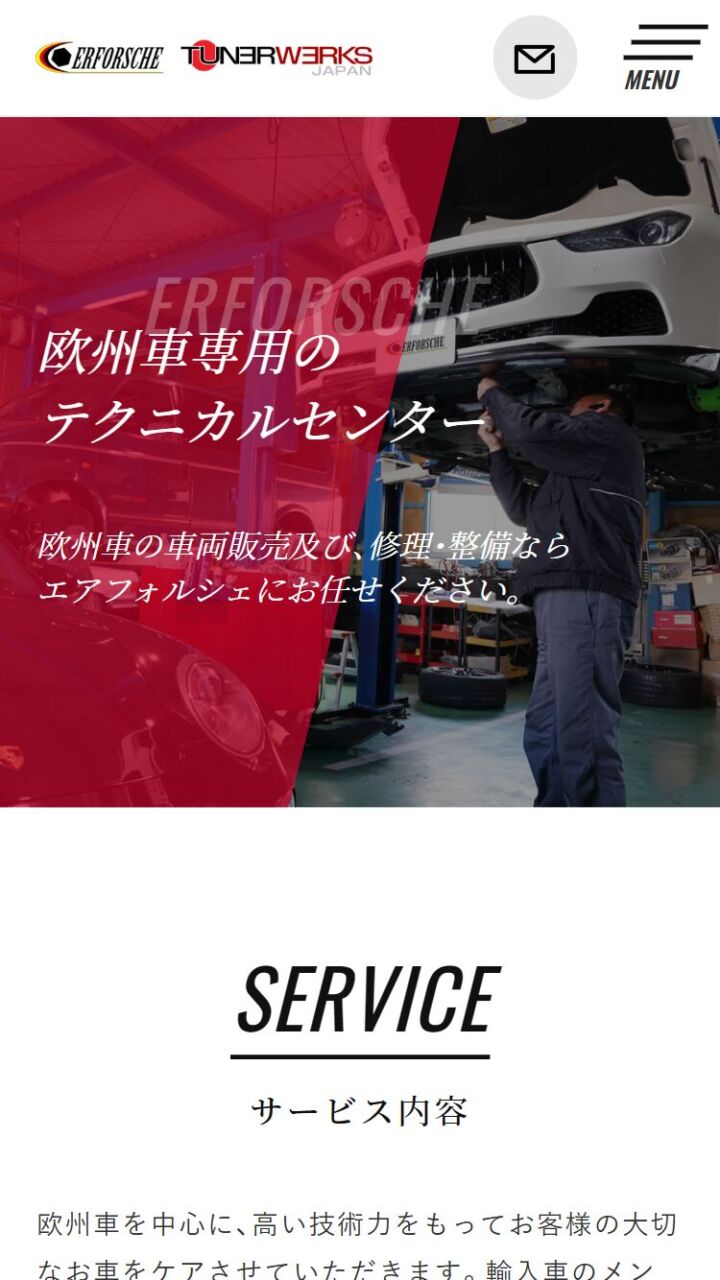 (株)ERFORSHE 様 スマートフォンでの表示 サービス内容ページ 顧客名 株式会社ERFORSHE URL https://erforsche.com/ 制作物 ホームページ 業種 自動車・自転車 エリア 大阪府岸和田市