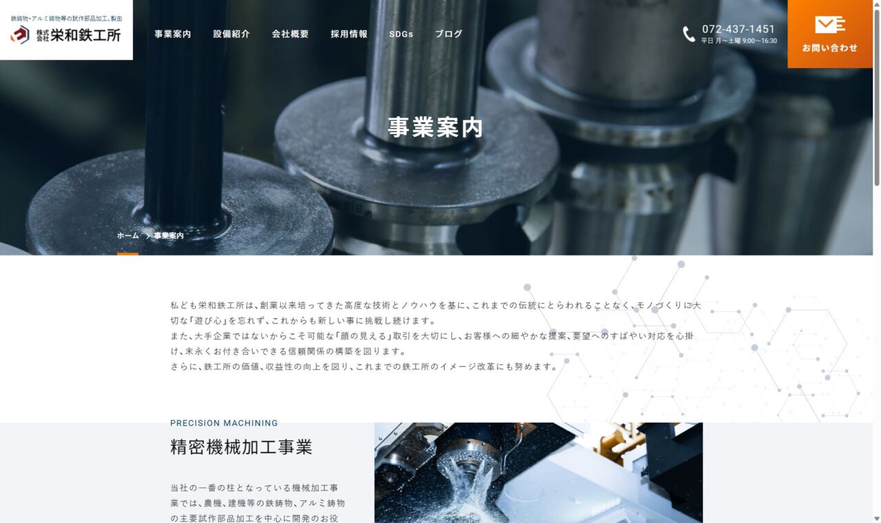 (株)栄和鉄工所 様 スマートフォンでの表示 事業案内ページ 顧客名 株式会社栄和鉄工所 URL https://eiwatekko.co.jp/ 制作物 ホームページ 業種 製造・工業 エリア 大阪府岸和田市