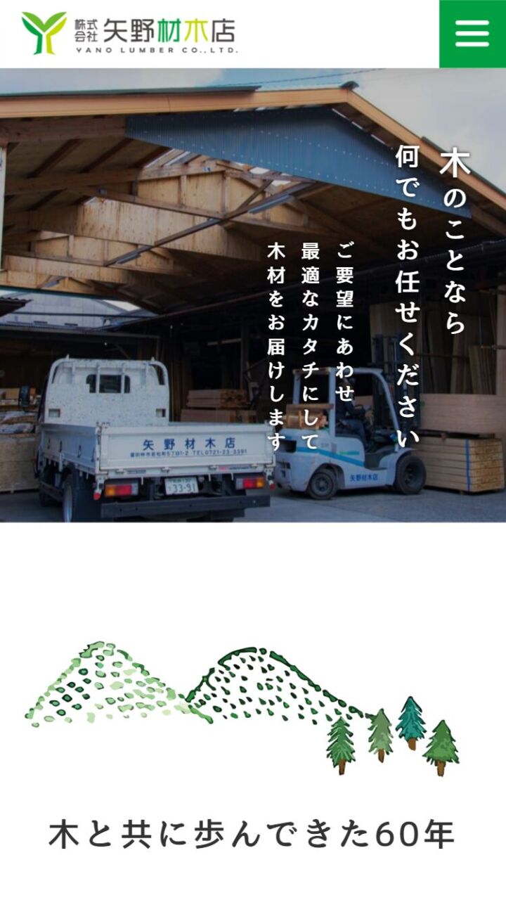 (株)矢野材木店 様 スマートフォンでの表示 理念ページ 顧客名 株式会社矢野材木店 URL https://yanozaimoku.com/ 制作物 ホームページ 業種 建築・住宅・不動産 製造・工業 エリア 大阪府富田林市
