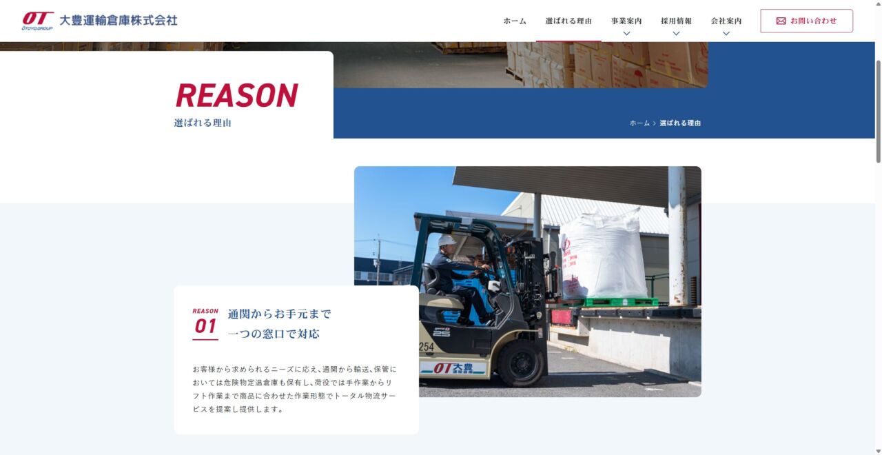 大豊運輸倉庫(株) 様 スマートフォンでの表示 アピールページ 顧客名 大豊運輸倉庫株式会社 URL https://ot-group.co.jp/ 制作物 ホームページ 業種 物流・交通 エリア 大阪府貝塚市