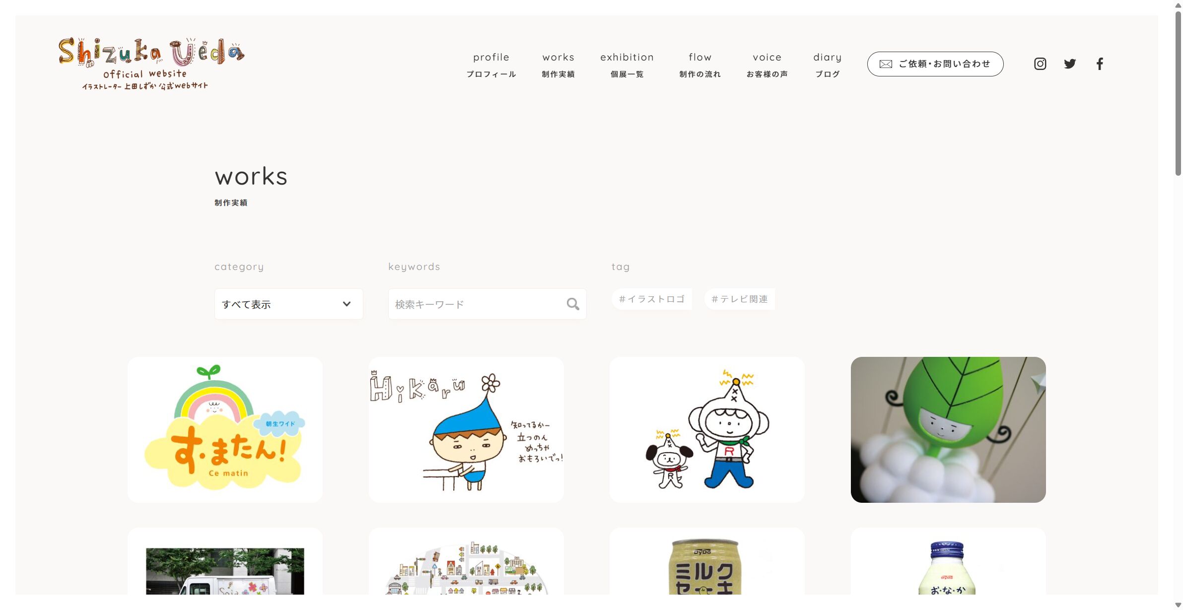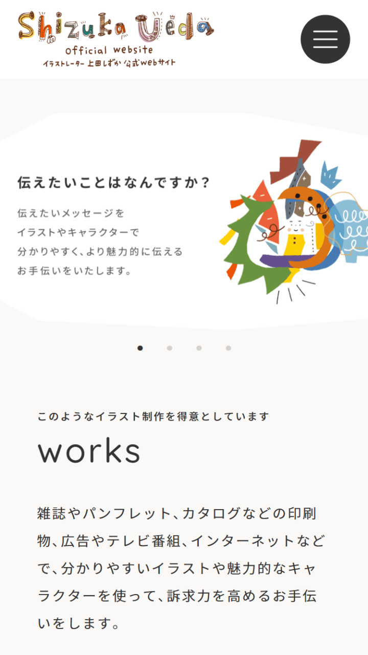 イラストレーター 上田しずか 様 スマートフォンでの表示 制作実績一覧ページ 顧客名 イラストレーター 上田しずか URL https://shizuka-ueda.jp/ 制作物 ホームページ 業種 デザイン・写真・イラスト