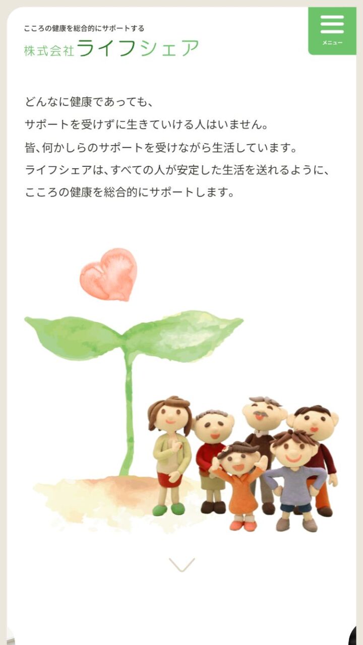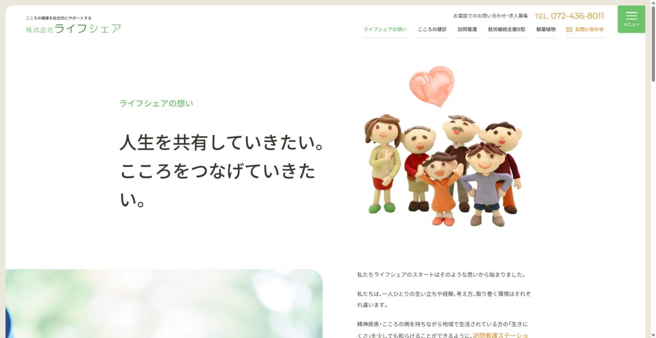 (株)ライフシェア 様 スマートフォンでの表示 理念ページ 顧客名 株式会社ライフシェア URL https://www.lifeshare.co.jp/ 制作物 ホームページ 業種 医療・福祉・環境 エリア 大阪府岸和田市