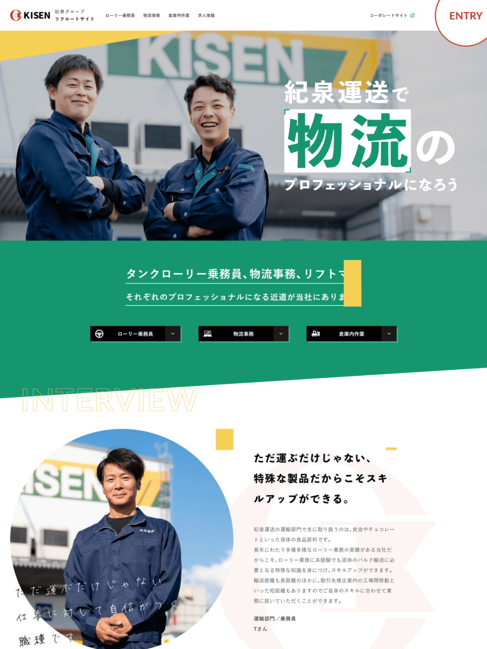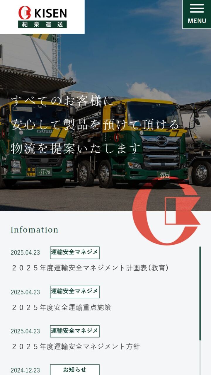 紀泉運送(株) 様 スマートフォンでの表示 事業内容ページ 採用LP(ランディングページ) 顧客名 紀泉運送株式会社 URL https://kisen.co.jp/ 制作物 ホームページ 業種 物流・交通 エリア 大阪府泉佐野市