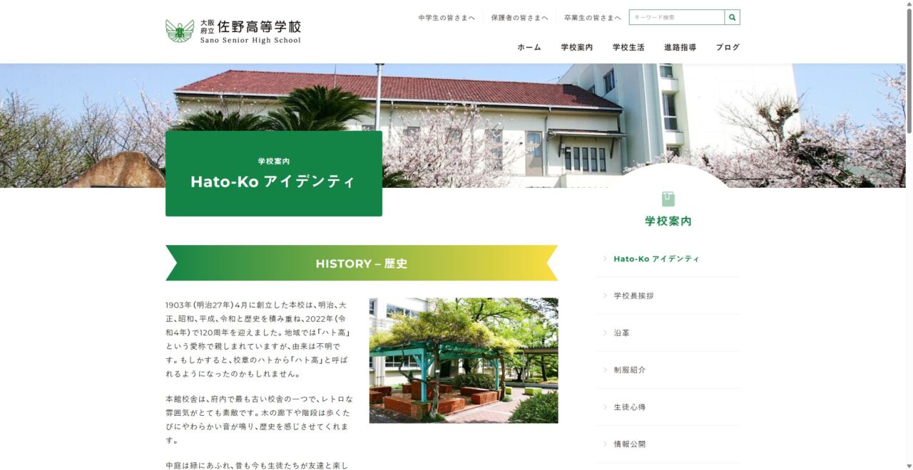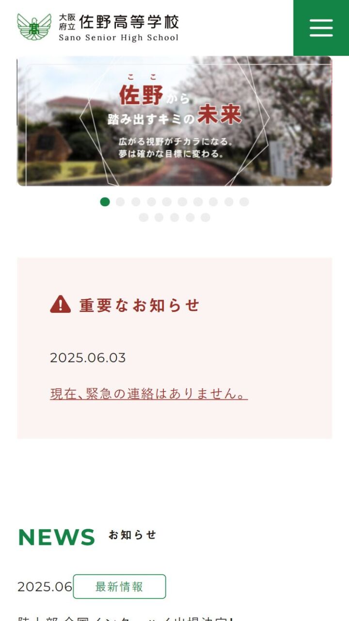 大阪府立 佐野高等学校 様 スマートフォンでの表示 学校案内ページ 顧客名 大阪府立 佐野高等学校 URL https://sano-h.ed.jp/ 制作物 ホームページ 業種 学校・教育 エリア 大阪府泉佐野市