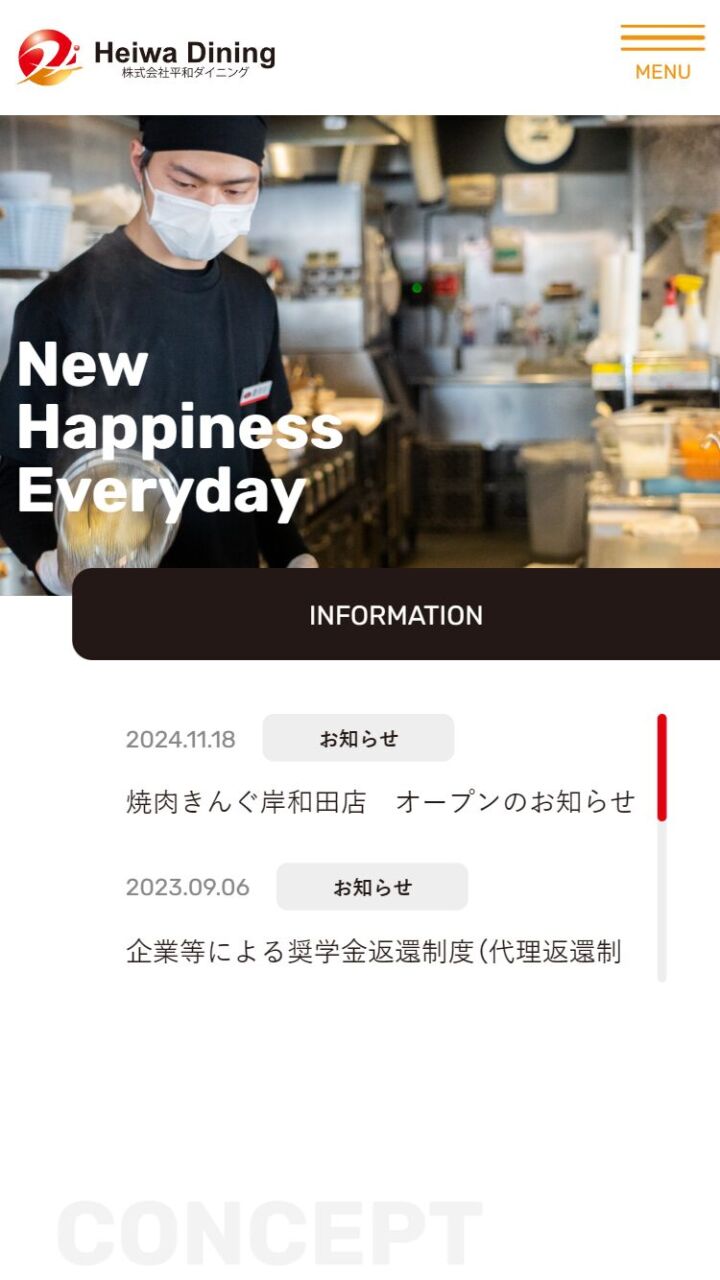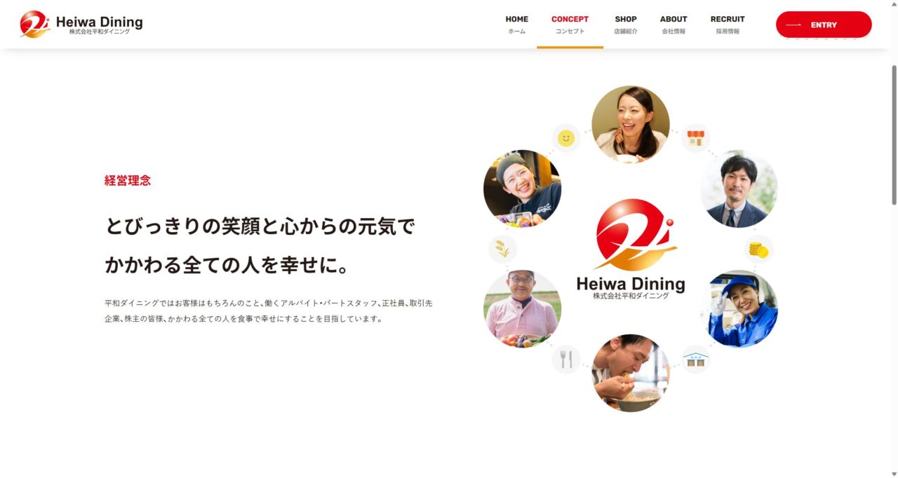(株)平和ダイニング 様 スマートフォンでの表示 理念ページ 顧客名 株式会社平和ダイニング URL https://heiwa-dining.com/ 制作物 ホームページ 業種 実店舗・商業施設 エリア 大阪府泉大津市