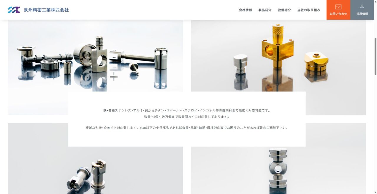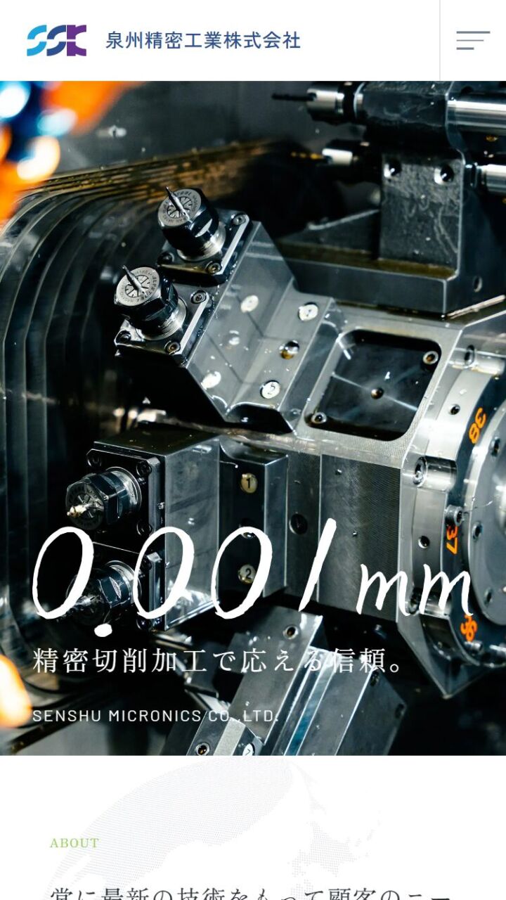 泉州精密工業(株) 様 スマートフォンでの表示 製品紹介ページ 顧客名 泉州精密工業株式会社 URL https://senshu-micronics.co.jp/ 制作物 ホームページ 業種 製造・工業 エリア 大阪府岸和田市